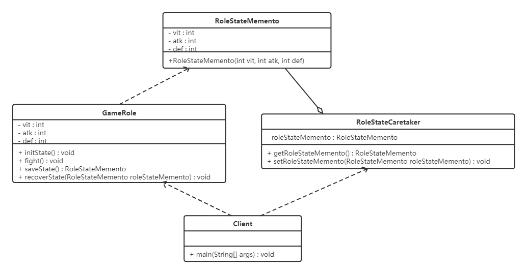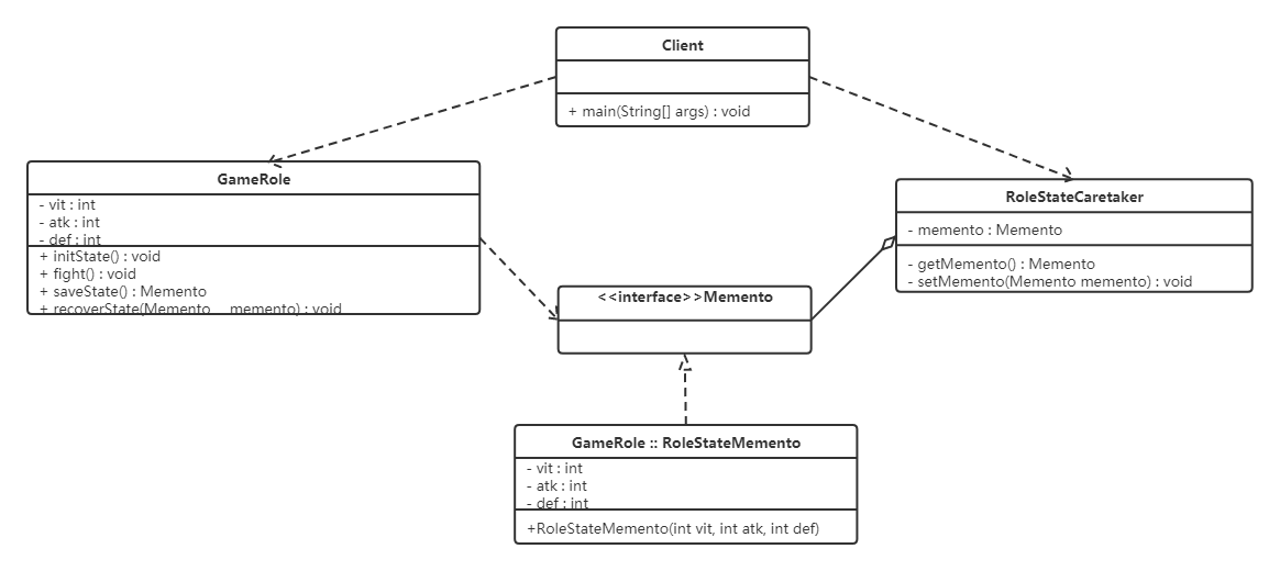 RoleStateMemento 设为 GameRole 的内部类,从而将 RoleStateMemento 对象封装在 GameRole 里面;在外面提供一个标识接口 MementoRoleStateCaretaker 及其他对象使用。这样 GameRole 类看到的是 RoleStateMemento 所有的接口,而RoleStateCaretaker 及其他对象看到的仅仅是标识接口 Memento 所暴露出来的接口,从而维护了封装型。类图如下: