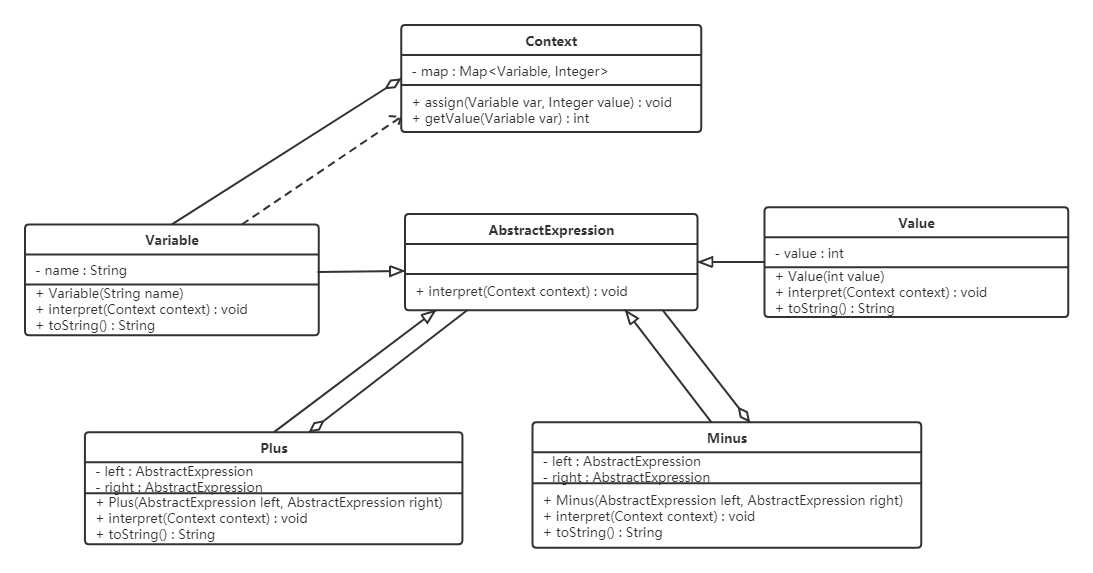 • 环境(Context)角色:通常包含各个解释器需要的数据或是公共的功能,一般用来传递被所有解释器共享的数据,后面的解释器可以从这里获取这些值。